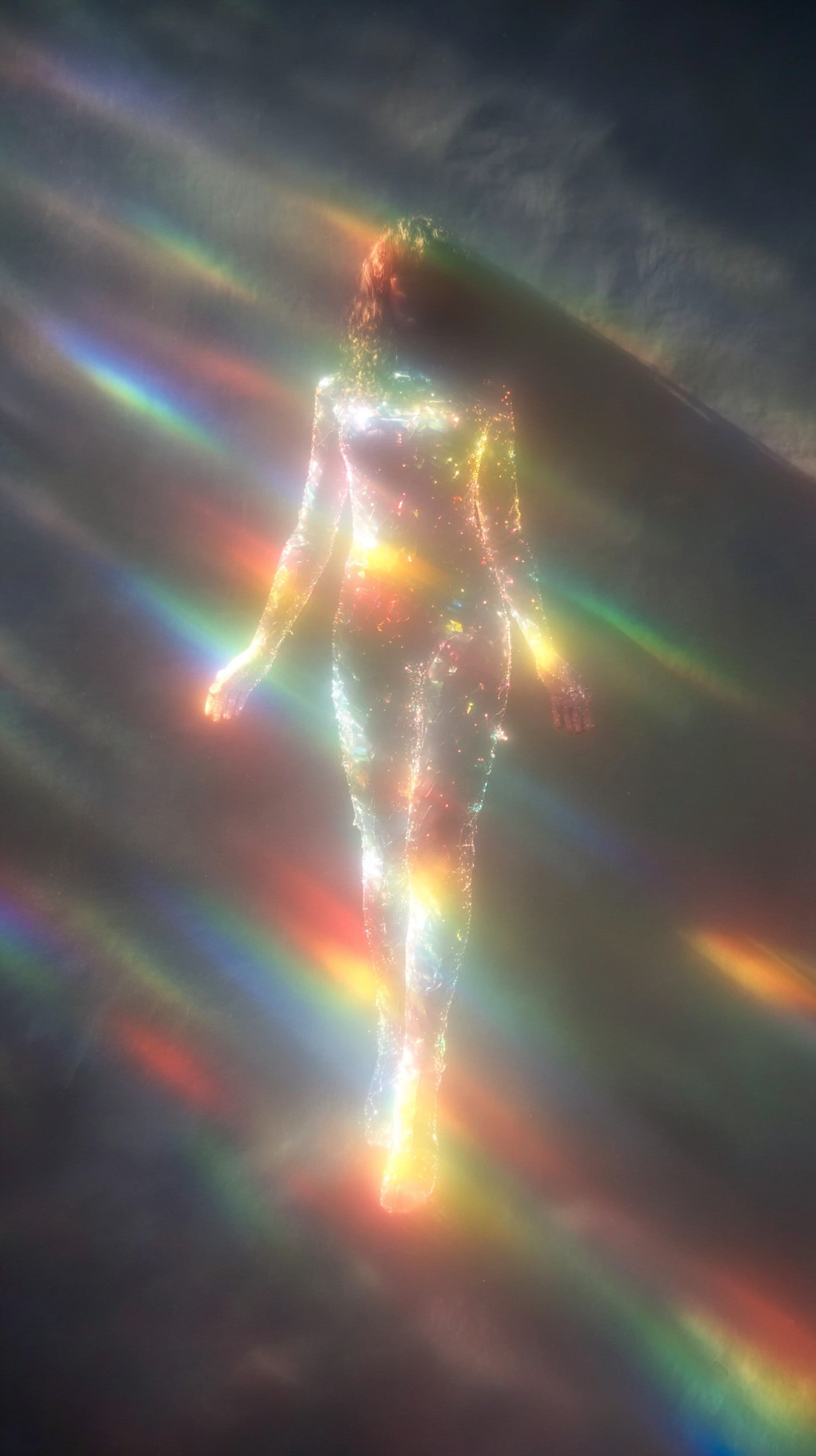 “Limitless Refraction” is a series of four self-portraits created through photography and digitally transformed with fractured light, refractions, and spectral color. Each portrait captures a different stage of metamorphosis, as my body dissolves, warps, and re-emerges through shifting prisms of rainbow and shadow.